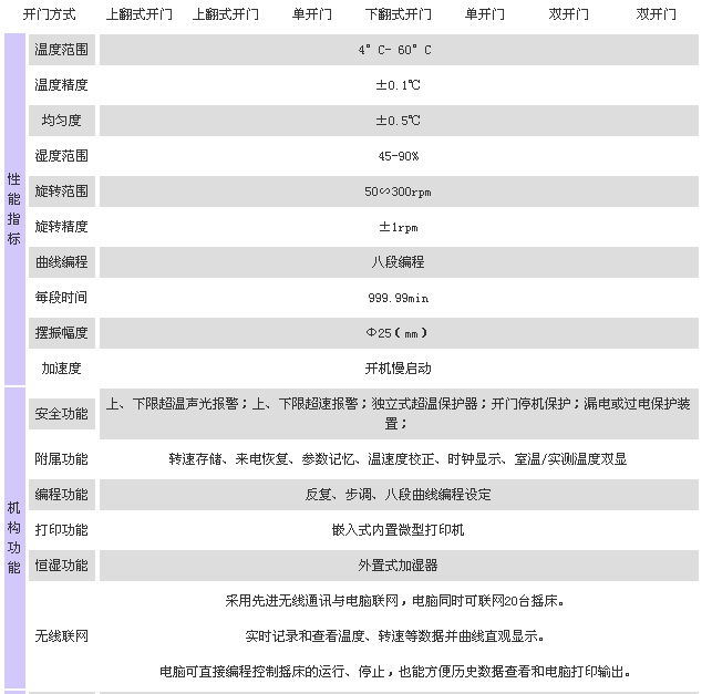 無線通訊與電腦聯網 + 曲線顯示 + 八段編程 + 打印輸出 + 恒濕 + 光照