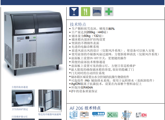 Scotsman雪花冰是一種最自然形態(tài)的冰,溫度略低于零度,很容易取用和堆放。斯科茨曼提供二種雪花冰:雪花冰和優(yōu)質(zhì)雪花冰,雪花冰含水量在25%較為潮濕但可塑性能很好適用性很廣。優(yōu)質(zhì)雪花冰更緊致含水量在15%-18%比普通的雪花冰更干燥,在需冷藏的陳列臺(tái)能長(zhǎng)時(shí)間保持濕潤(rùn)而中途無須添加冰。雪花冰和優(yōu)質(zhì)雪花冰很適合試驗(yàn)室,飯店生鮮陳列,酒店自助餐臺(tái),凍飲的預(yù)制作,鮮果和生鮮的展示,葡萄酒和香檳酒的冷卻等等。