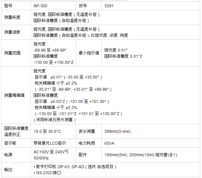 AP-300自動旋光儀只要將裝滿樣品的旋光管放入樣品槽里面按開始鍵就開始自動測量,是適合用在制藥,香料,化妝品,化工藥品及食品行業(yè)測量旋光度。或適合用在制糖行業(yè)測量國際標(biāo)準(zhǔn)糖度。AP-300自動旋光儀是依據(jù)日本藥局法。具有上下限設(shè)定功能,測量數(shù)據(jù)存儲功能及手動校正功能。