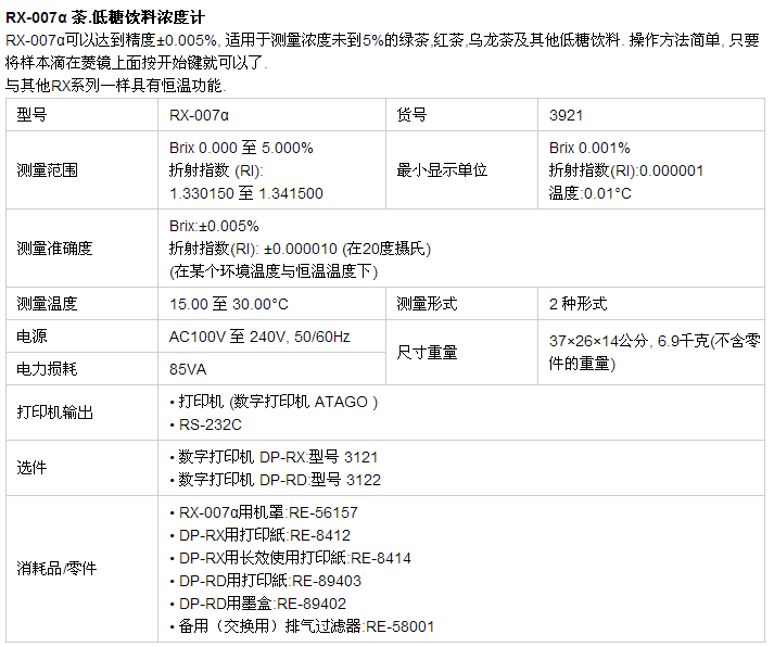 • ATAGO(愛(ài)拓) RX-007α全自動(dòng)數(shù)顯臺(tái)式折光儀(茶飲料/低糖飲料專用)