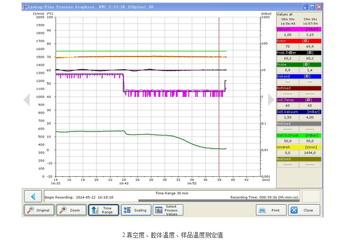 德國Christ公司是專業(yè)生產(chǎn)真空離心濃縮儀的廠家,有著60多年的歷史。就其濃縮儀中樣品溫度的變化,我們進(jìn)行了詳細(xì)的數(shù)據(jù)記錄(圖1、圖2所示),從圖1我們發(fā)現(xiàn),當(dāng)真空值設(shè)為7mbar,腔體加熱溫度設(shè)為79℃時(shí),離心腔在61~79℃逐漸升溫,對(duì)應(yīng)的轉(zhuǎn)子溫度是51.1~71.7℃逐漸升溫,而樣品溫度在14.7~18.2度之間。