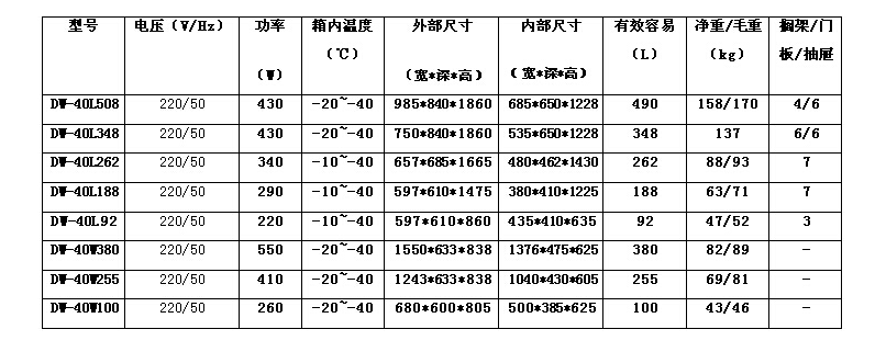 DW-40L348 /DW-40L508大容量-40℃低溫保存箱 安全系統(tǒng)多種故障報(bào)警(高低溫報(bào)警、傳感器故障報(bào)警、斷電報(bào)警)兩種報(bào)警方式(聲音蜂鳴報(bào)警、燈光閃爍報(bào)警)開機(jī)延時(shí)保護(hù)功能性能可靠微電腦控制,溫控精度高溫度數(shù)字顯示,讀取方便采用國(guó)際知名品牌高效壓縮機(jī),EBM風(fēng)機(jī)可靠性高高密度發(fā)泡層,無氟制冷劑擱架直冷設(shè)計(jì),降溫快雙毛細(xì)管設(shè)計(jì),均勻性高人性化設(shè)計(jì)雙門設(shè)計(jì),配備獨(dú)立門鎖扣,便于物品分類存放或多人使用精巧門鎖扣設(shè)計(jì),鎖緊力和距離可調(diào),可配備雙掛鎖,安全可靠門把手設(shè)計(jì),開關(guān)更省力抽屜設(shè)計(jì),儲(chǔ)藏物品更方便寬電壓帶設(shè)計(jì),適合198V~238V電壓下使用LED數(shù)字溫度顯示,便于觀察底腳組件可調(diào)節(jié),便于機(jī)器移動(dòng)并自鎖。DW-40L92/DW-40L188/DW-40L262/DW-40W380/DW-40W255/DW-40W100超低溫冰箱優(yōu)點(diǎn)制冷系統(tǒng)采用國(guó)際知名品牌高效壓縮機(jī)環(huán)保無氟制冷劑德國(guó)名牌EBM風(fēng)機(jī)高密度保溫層,保溫效果良好蒸發(fā)器直接做為擱物架,制冷速度快溫度控制微電腦控制,溫度數(shù)字顯示,箱內(nèi)溫度-10~-40℃可調(diào)超溫報(bào)警,斷電記憶功能安全系統(tǒng)多種故障報(bào)警(高低溫報(bào)警、傳感器故障報(bào)警、斷電報(bào)警)兩種報(bào)警方式(聲音蜂鳴報(bào)警、燈光閃爍報(bào)警)開機(jī)延時(shí)保護(hù)功能人性化設(shè)計(jì)抽屜設(shè)計(jì),儲(chǔ)藏物品更方便LED數(shù)字溫度顯示,便于觀察寬電壓帶,適合187V-242V電壓下使用門把手設(shè)計(jì),開關(guān)更省力腳輪設(shè)計(jì),便于移動(dòng)門鎖設(shè)計(jì),儲(chǔ)物安全